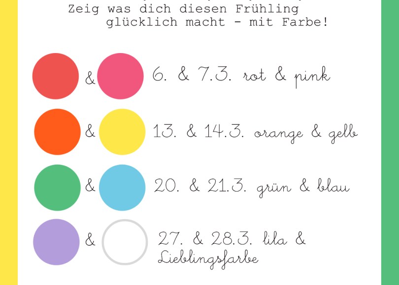 Es ist also genau der richtige Zeitpunkt um mit Farbe alles zu sammeln, was uns gerade glücklich macht. Damit es nicht in Stress & Arbeit ausartet, gibt es jedes Wochenende eine Farbkombination, die es zu entdecken gilt.